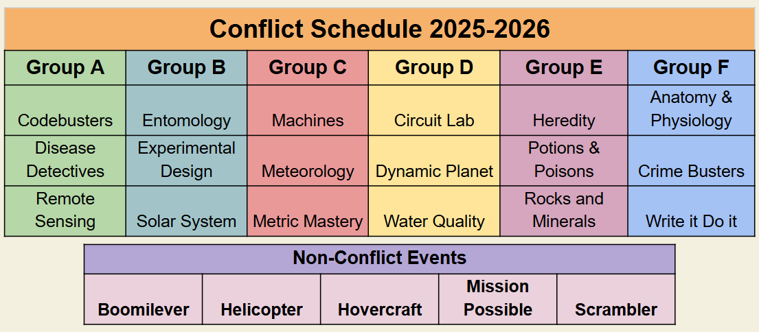 Please keep the conflict schedule in mind as well when selecting your events.